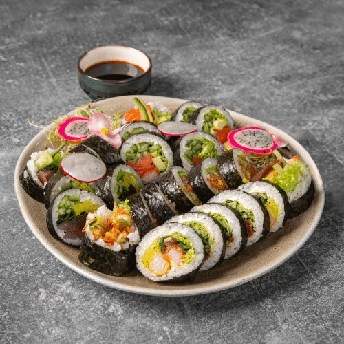 6x futomak krewetka parzona, 8x hosomak sandacz tempura